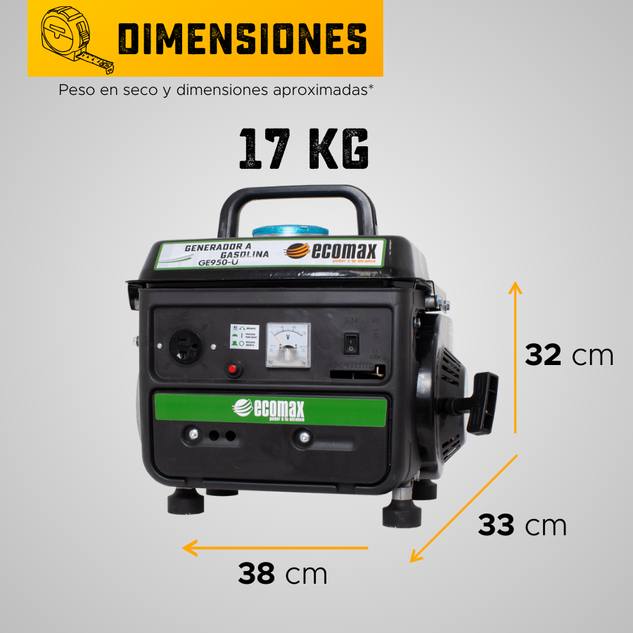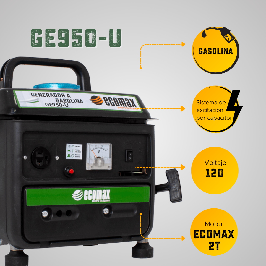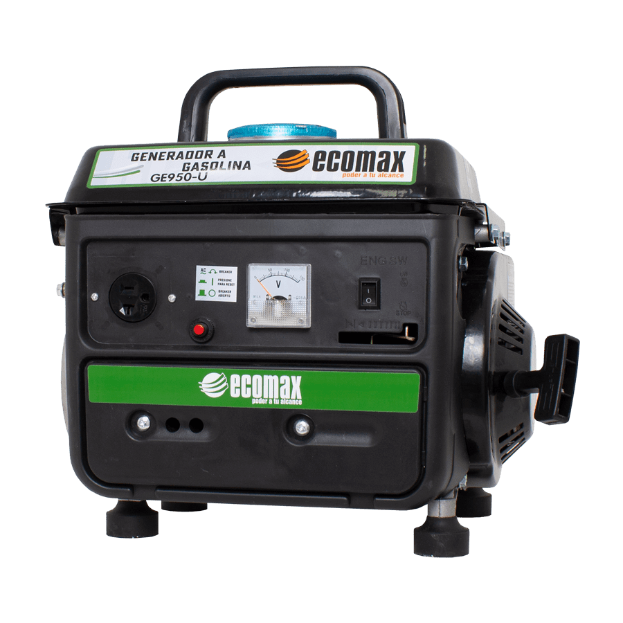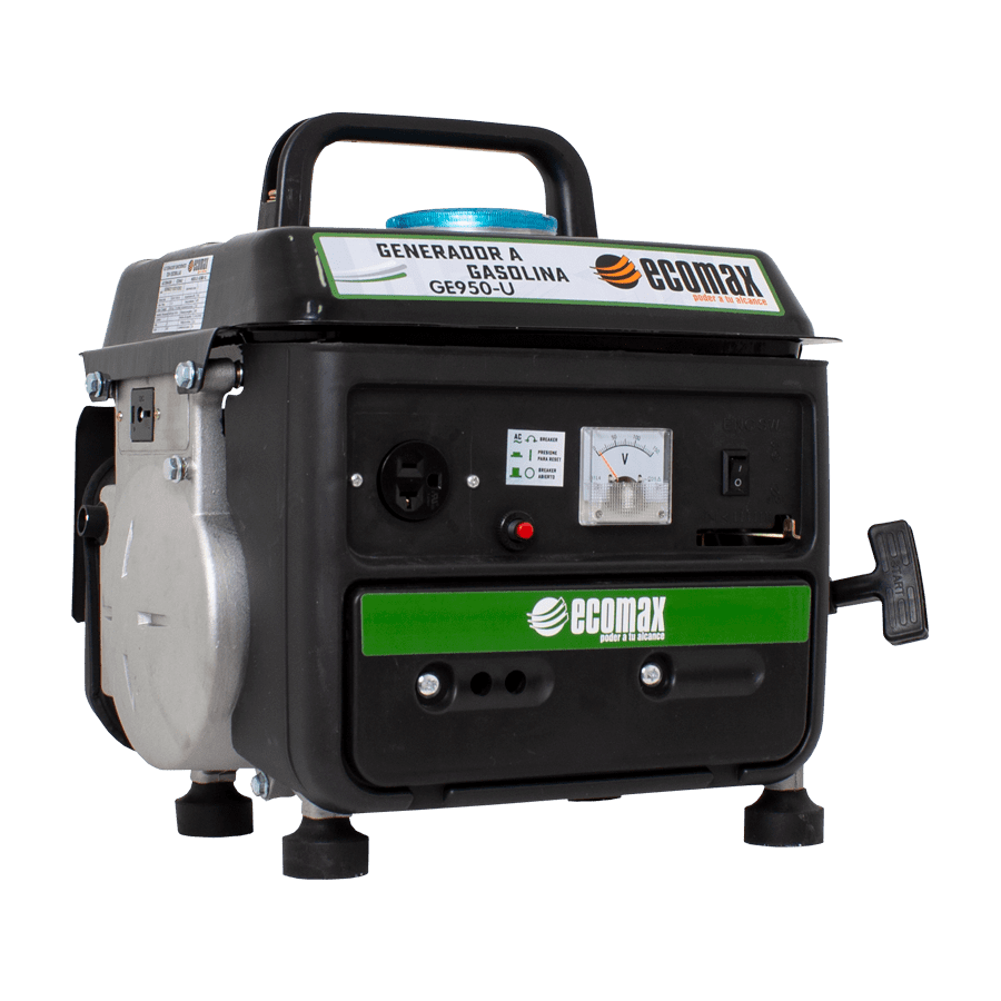 MARCA ECOMAX / REF. GE950-ULos generadores gasolina ECOMAX permiten atender las necesidades de generación de energía con eficiencia, economía en su precio y gracias a su sistema de regulación mediante capacitor, aportan un excelente desempeño en arranques de cargas de tipo industrial (muy apropiados para el sector de la construcción); su tablero incluye breaker de protección, salidas de doble voltaje con selector en las versiones monofásicas y tomas y enchufes machos entre sus accesorios; en potencias superiores a 6.5kVA; en su mayoría cuentan con KIT de ruedas que permiten un fácil desplazamiento.