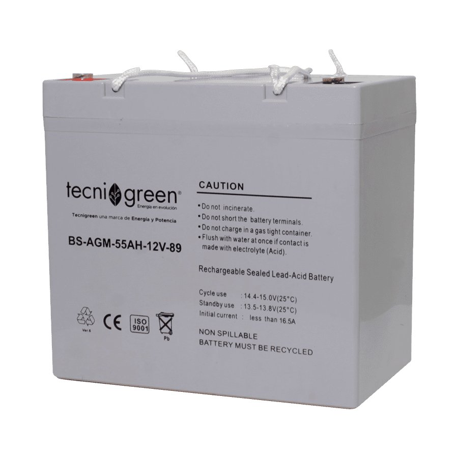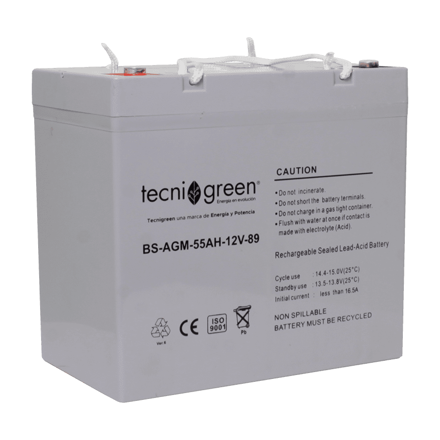 MARCA TECNIGREEN / REF. BS-AGM-55AH-12V-89Batería Ciclo Profundo, Plomo acido, libre de mantenimiento válvula VRLA, para aplicaciones con energía solar. Diseñadas para trabajar con descargas profundas de acuerdo a la gráfica